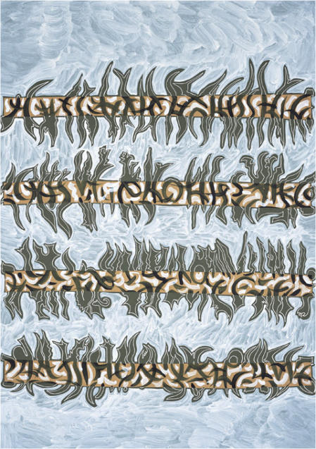 In the section of twenty eight works that appear under the title of Fairy Tales, which include religions and political systems (collage), she deals with patterns, whose combination and assembling are seductive but dismembered against a background of changing colouring.The cryptic tone of these formations in their abstract agility, their hieratic austerity and mysterious gentleness, translate the effect of the holy and the fascination it exerts on the mind. A mixed feeling of wonder and confusion, of light and darkness, of primeval force and totemic authority pervades all these pictures. Parallel bars of white flames fill in the imaginary space, reproducing the visual echo of fairy tales.