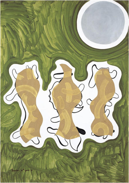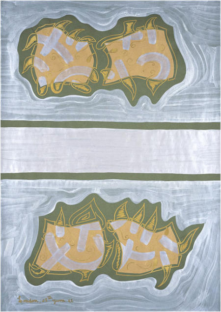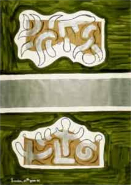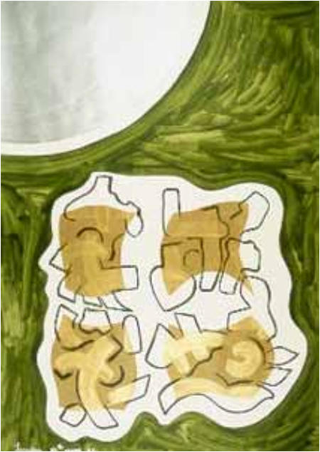 In a subgroup of eight Fables (collage), that deal with all the systems based on Christianity, truncated forms of totemistic symbolism float around circles of lost perfection in a search for a balance that reflects on the gloominess of the background.