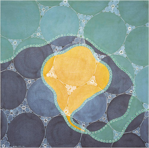 A germinating world, teeming with life, asserts itself in cellular composition as a bridge or a stage of transition between embryonic forms of life and the complex development of the organism. There is in them an eerie combination that comes from the mysteries of biology, or seen as such, and the division, separation and agglutination which marks life in its primeval forms. Their aesthetic character is stressed in these paintings, as the title Fruition suggests, drawing our attention to aspects of natural life that had remained hitherto unnoticed or neglected as forms of art.